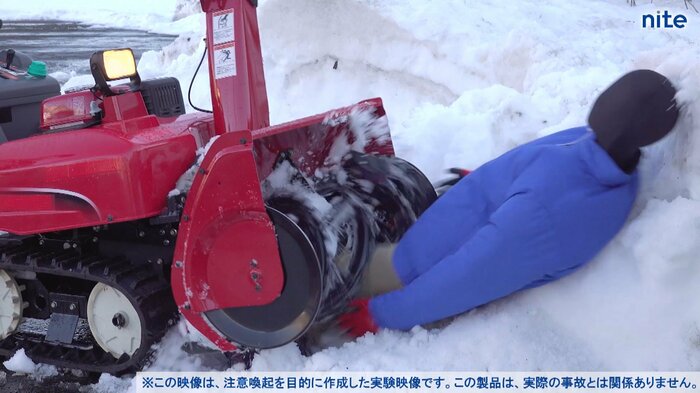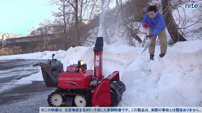 NITE=製品評価技術基盤機構は実験動画を公開し、除雪機の安全機能を正しく使用することなど注意を呼びかけている。