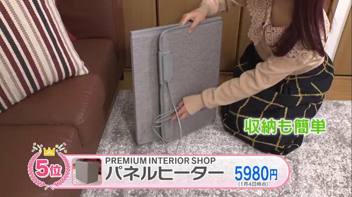 第5位は、PREMIUM INTERIOR SHOPのお一人様用「パネルヒーター」(5980円)。足の周りに置いてボタンを押せば、じんわり暖かくなる。