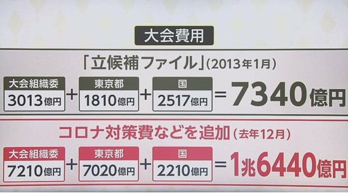 当時の大会組織委員会の森喜朗前会長はこのように話し、大会の延期や新型コロナウイルス対策に伴う追加経費を総額2940億円計上することで、大会組織委員会、東京都、国の三者で合意したと発表した。こうして2020年12月に公表された「バージョン5」では、大会経費の総額は1兆6440億円にまで膨れ上がっていた。