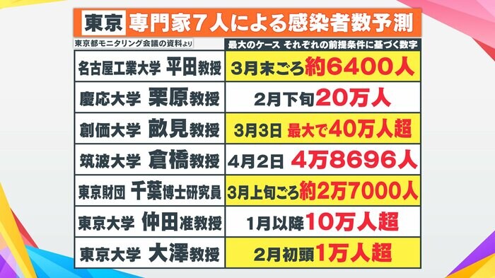 13日の東京都モニタリング会議では、専門家7人による感染者数予測がされ、中には3月3日に最大で40万人を超えるという数字もあります。