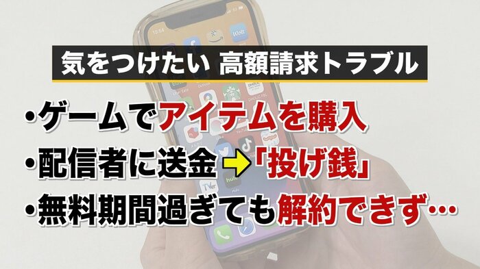 例えばゲームで有料のアイテムを購入したり、動画の配信者にオンラインで送金をする、いわゆる「投げ銭」をしたり、アプリのインストール後、無料期間が過ぎても解約せず高額請求されるケースなどに注意が必要だ。