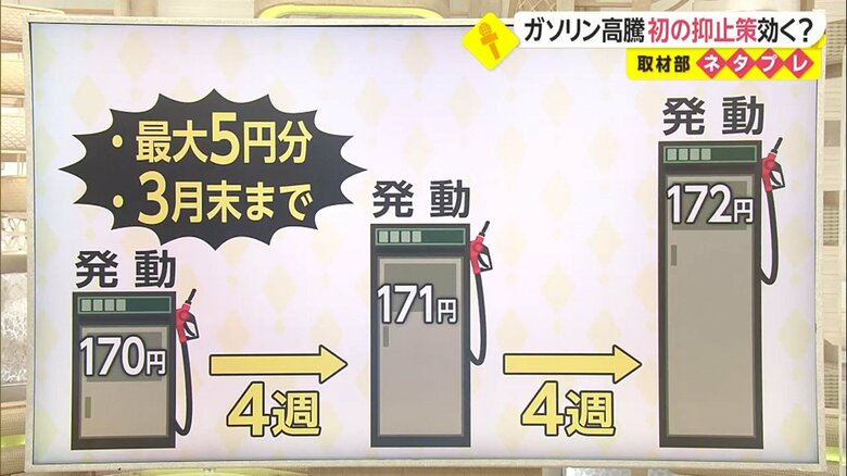 170円超えたので発動されましたけれども、4週間も経てば170円の高値にも慣れるでしょうということで、4週間後には171円になったら発動しますよ、さらに4週間後には172円なら発動しますよという感じで、トリガーがだんだん上がってくるんですね。それで激変を緩和するということなんです。また補助金の上限は1リットル5円で、 3月末までという期限も切ってあります。 あくまでコロナからの立ち直り期間という特殊な時期の、限定的な措置ということなんです。
