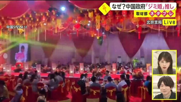 中国が進める結婚に関するある政策についてお伝えします。それは“ジミ婚推進政策”というもの。この政策がどんなもので一体なぜ導入されたのか?まず、こちらの映像をご覧ください。広い会場内に所狭しと置かれた机。そこでは多くの人が食事をしていますが、実はこれ、1組の夫婦の結婚式の様子です。とてつもなく大規模な宴会なのです