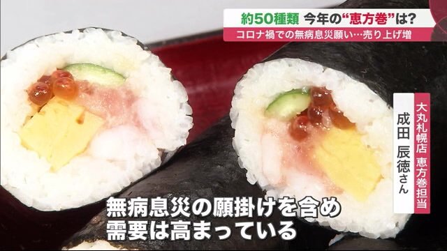 1月も後半に入り、そろそろ気になってきた方もいるのでは。2月3日の節分に向けて札幌市内のデパートでは、2022年オススメの恵方巻がお披露目された。