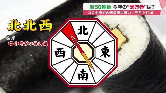 今年の恵方の北北西を向いて、恵方巻を"無言で食べる"と運気が上がるといわれています