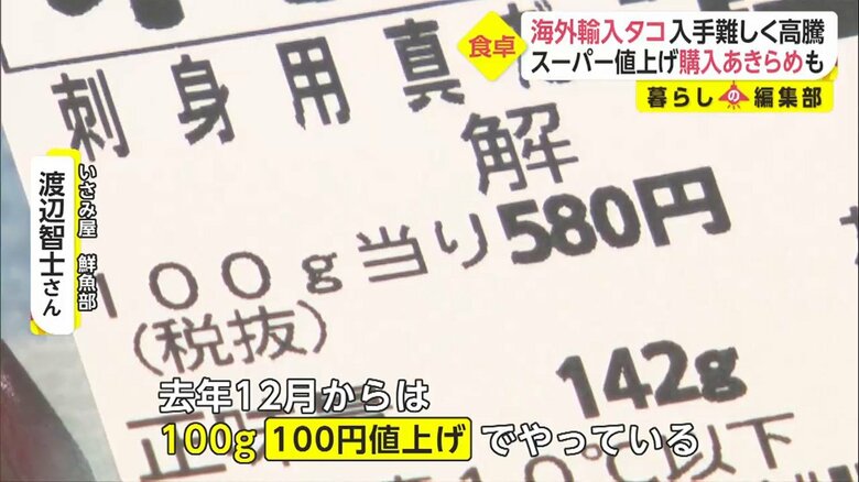 私たちの食卓への影響はどうなのか。スーパー「いさみ屋」ではモーリタニア産の大ぶりな脚1本142グラムが823円で販売されていた。