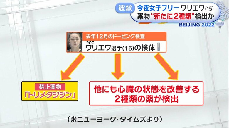 こうした中、2月17日に行われるフリーを前にドーピング問題に関する新たな情報。ニューヨーク・タイムズによると2021年12月のドーピング検査でワリエワ選手の検体から、禁止薬物の「トリメタジジン」の他に心臓の状態を改善する“2種類の薬”が新たに検出されたという。