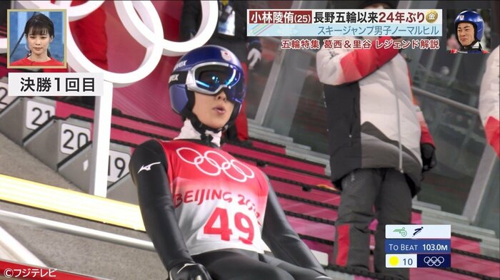 迎えた決勝2回目。不利とされる追い風から有利となる向かい風に変わったが、有力選手は飛距離を伸ばすことができない。小林のスタートが近づく中、緊張気味の葛西さん。「ここから残り10人がどういう風に当たってどういうジャンプするかでメダルが決まります。ちょっとでも向かい風に当たったら小林は100%優勝します」と話していた。