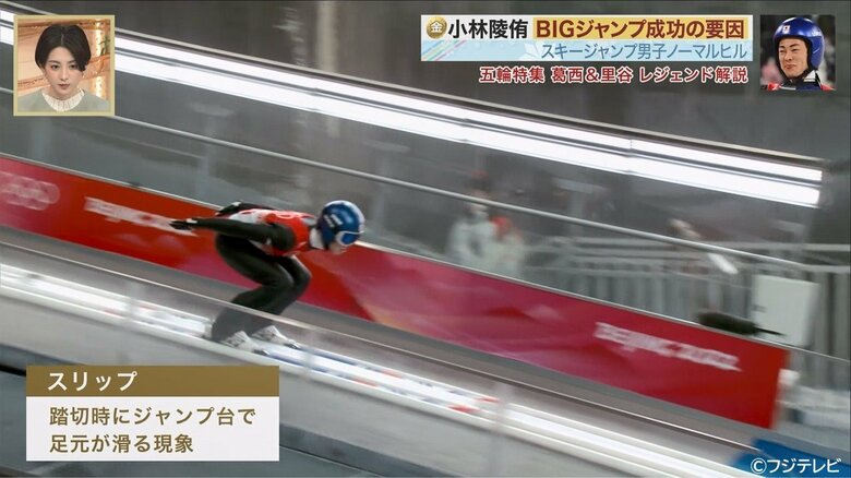 スリップしていない状況とはテイクオフのときの膝の使い方で、ここで滑らずに踏み出すことで、スピードとパワーを十分に活かせている状況をいう。「真ったいらの氷のところで幅跳びをしようとすると滑るじゃないですか。あの滑る感じがテイクオフするときに起きる。スリップしないでパワーを地面に伝えて飛んでいくのが陵侑は一番上手」と小林のテイクオフを称賛した。