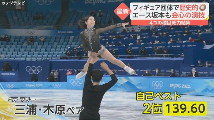 ペアフリーでは、三浦・木原ペアが139.60の自己ベストを更新。この種目で2位に入り、この時点で日本の銅メダル以上が確定した。