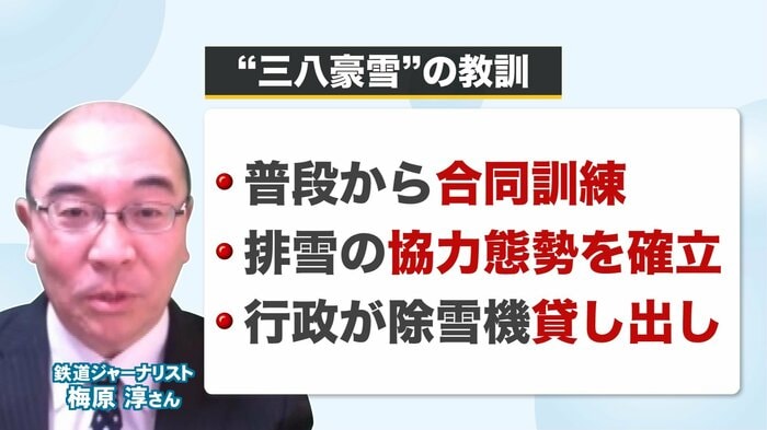 JRと行政が連携するために必要なことは何か。鉄道ジャーナリストの梅原淳さんは、普段から合同訓練をすること、排雪の協力態勢を確立すること、行政が除雪機を貸し出すことなども大事と指摘している。