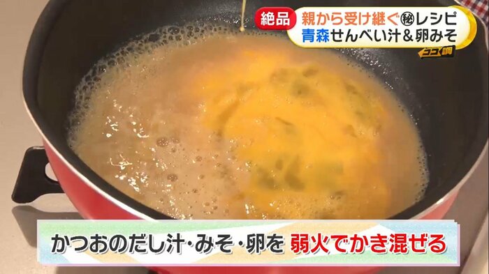 そこに溶き卵を加えて弱火でかき混ぜ、卵が半熟、とろとろになったら、ご飯とも相性抜群の青森名物「卵みそ」の完成。