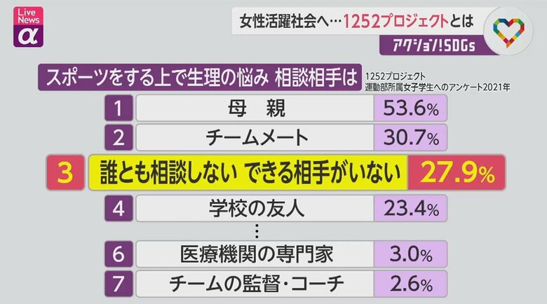 伊藤さんが活動する1252プロジェクトが全国600人以上の運動部所属の女子学生にアンケートを実施したところ、競技をするうえで生理の悩みを感じている学生は42.4%にのぼり、さらに悩みはあっても対策はしていないと答えたのは63.4%と、多くの人は対策できていないことが明らかになった。