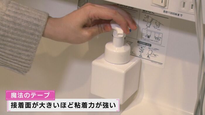 ハンドソープには、アマゾンや楽天などで購入できる「魔法のテープ 極(強力両面テープ)」(Next up株式会社 1180円)を使う。