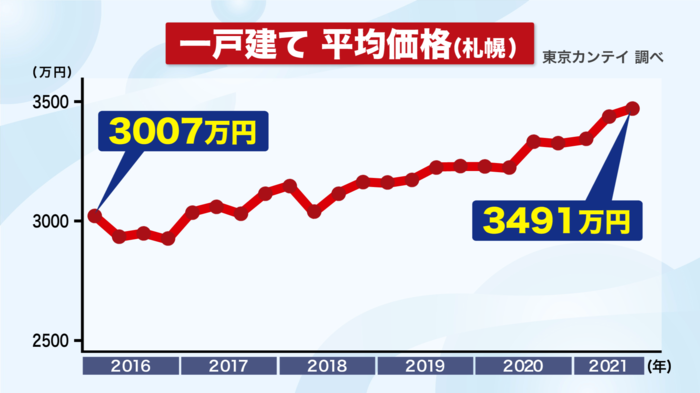 民間の不動産鑑定会社の調査によると、土地と建物を合わせた新築の一戸建ての札幌市内の平均価格は2016年には3000万円を下回ることもあったが、2021年は3500万円に迫る勢いとなっている。