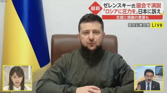 ウクライナのゼレンスキー大統領が3月23日午後6時、日本の国会で演説を行った。