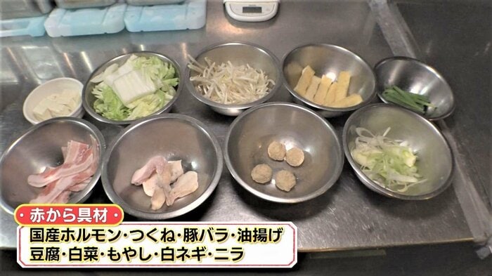 鍋に入れる具材は、国産ホルモン、つくね、豚バラ、油揚げ、豆腐、白菜、もやし、白ネギ、ニラの9種類。たくさんの白菜に、名古屋コーチン入りのつくねや豚バラ肉などが入る。そして味の決め手のスープは、見た目は少し辛そうだが、辛いのが苦手な人でもおいしく食べられるワケがある。