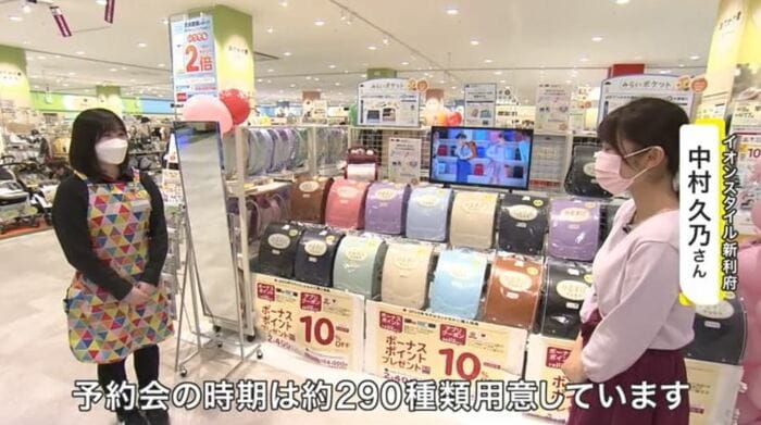 仙台市内の百貨店のランドセル売り場です。こちらは4月6日オープンしたということですが、はやくも2023年の小学1年生、つまり、今 年長さんのお子さんにむけたランドセルが販売されているんです