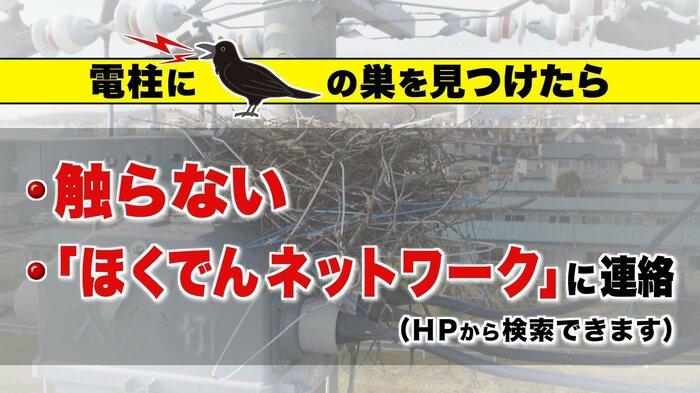 例年、4月から7月にかけて、カラスは子育ての時期を迎える。木の枝や金属製のハンガーを集めて電柱や街路樹に巣を作り、子育てをするが、このハンガーが電線と接触するなどして漏電・停電につながるという。