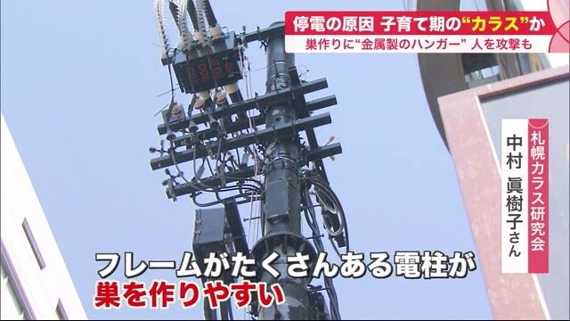 北海道電力によると、カラスがハンガーを電力設備に接触させたことで、停電が発生した可能性があるという。