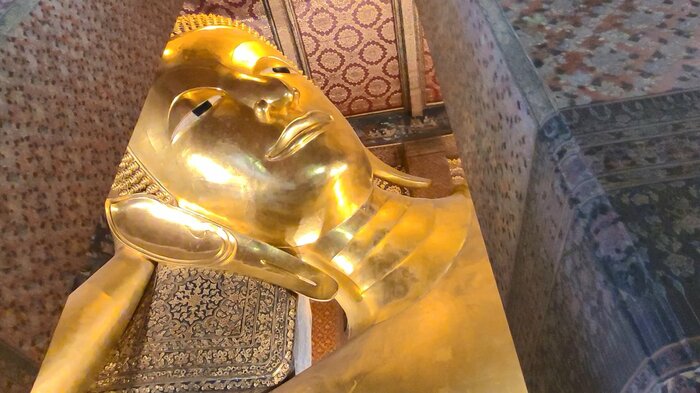 ここには全長46m、高さ15mの涅槃像が祀られていて、装飾が施された柱の間から黄金に輝く巨大な顔がこちらをのぞき込む。
