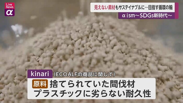 捨てられていた間伐材が主な原料で、プラスチックに劣らない耐久性をもっています。