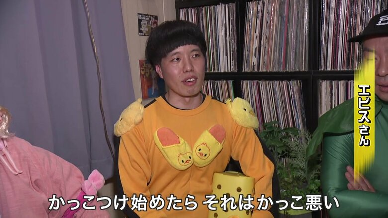 全身タイツやはっぴ、ジャージーを着て、スリッパを胸につけたり、造花を差したカゴを頭にかぶったり…この個性的な格好には信念がある。