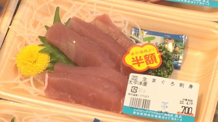 午後3時になると、早くも半額シールを貼ってタイムサービスを開始。翌日までが賞味期限のお刺身は半額に。まだ余裕があるものも割引して販売している。