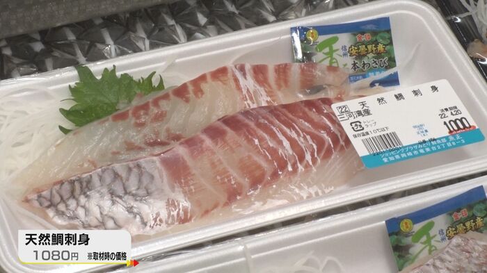 従業員の雇用を守りたい思いもあり、2010年3月にこのスーパーに出店。「ちゃんとしたものを出したい」という思いは、百貨店時代からのこだわりだ。アワビや金目鯛などの高級食材も並べている。