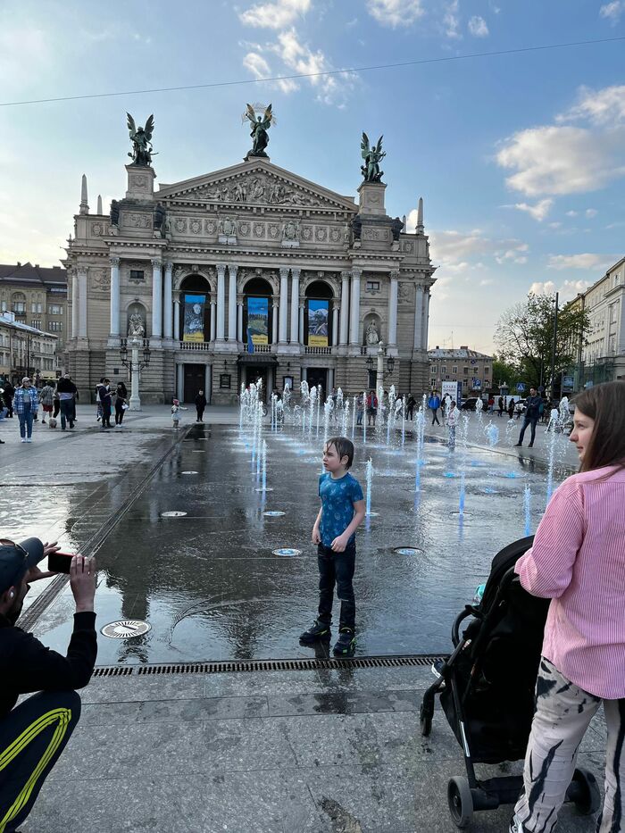 ホテルのそばにイワン・フランコ記念公園があり、遊具がある広場では多くの子ども連れの家族たちが遊んでいて、一瞬これが戦時下かと目を疑いました。世界文化遺産でヨーロッパの「隠れた宝石」と言われているリビウの歴史地区近くにはオペラバレエ劇場があり、プログラムも行われていました。劇場には多くの人々が集っていて、噴水のある所では子どもや若者たちが水と戯れていました