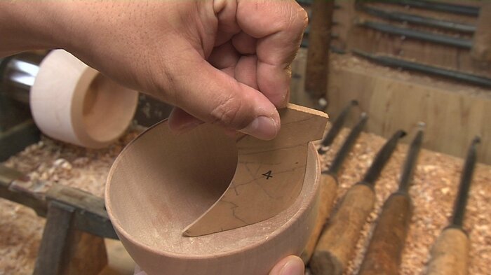 外側が終わると、続いては内側を削る。先ほど同様、型で確認しながら削ること6分。お椀の「木地(きじ)」ができた。