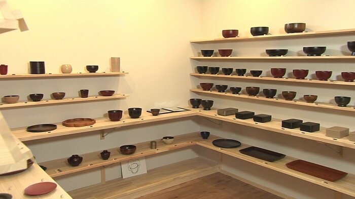 お椀だけでなく、様々な器やお弁当箱などもある。全て木と漆で作られている。