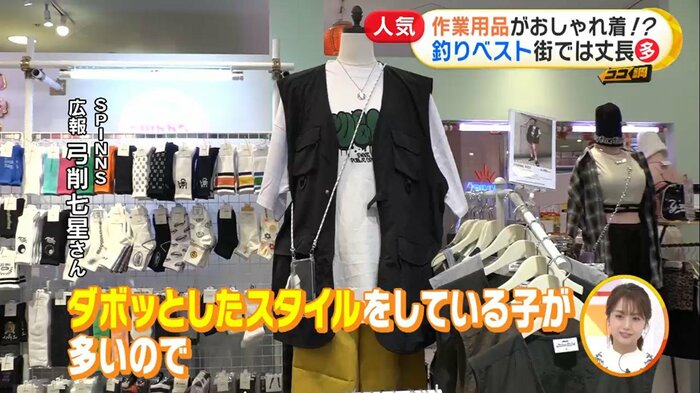 本来フィッシングベストは水辺で着用するため、丈が短めに作られていることが多い。しかしこちらの店では若者の流行に合わせて、丈の長いオーバーサイズに進化。取材した若者も、多くが丈の長いアイテムを着ていた。