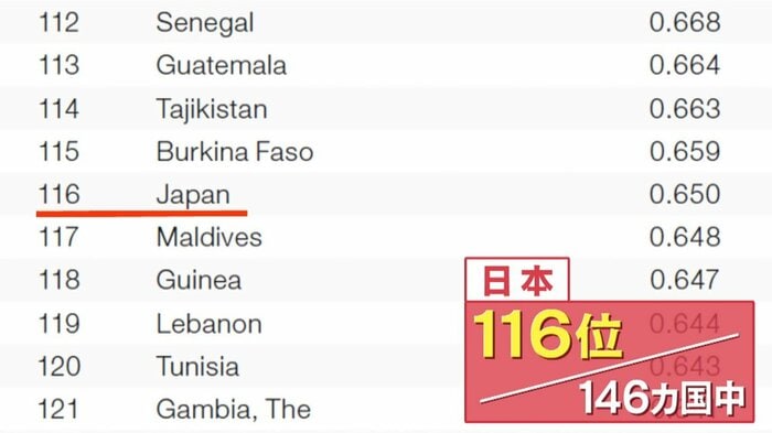その結果、平均値を下回る116位になりました。これは、G7だけでなく、アジアの近隣諸国である韓国や中国などよりも下の順位です。