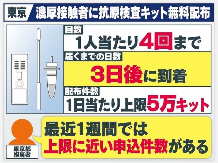 濃厚接触者に限り、東京都では抗原検査キットの無料配布を行っています。