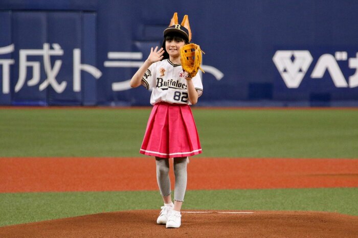 プロ野球、オリックス・バファローズVS東北楽天ゴールデンイーグルスの始球式に、市川ぼたんさんが子猫の耳としっぽのついたかわいい衣装で登場。