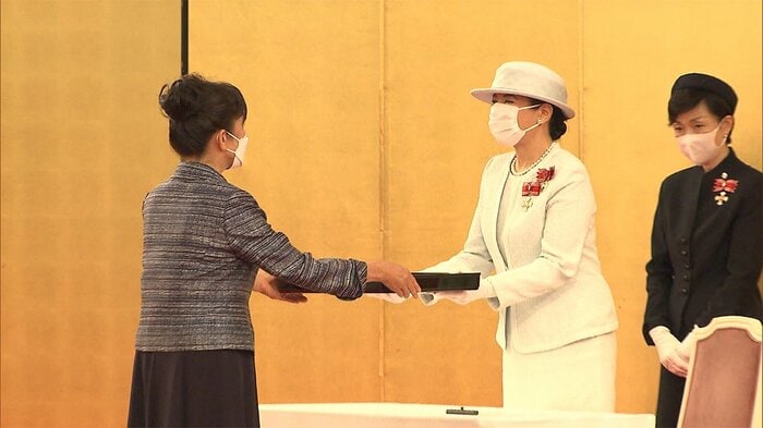 皇后さまは2019年8月の授与式以来3年ぶりに受章者に記章を手渡し、拍手で祝福されました。皇后さまはそれぞれの活動について質問を重ね、「健康に気を付けて頑張ってください」と声をかけられたということです。