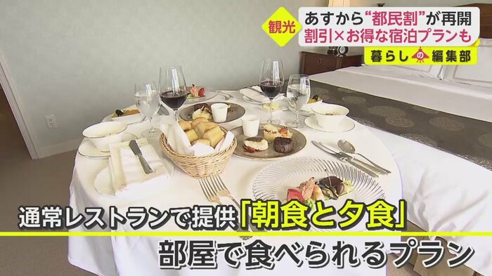 朝食も夕食もついて、通常より3万円以上安いこのプラン。都民割と合わせると6万1100円(2名1室利用分)になる。