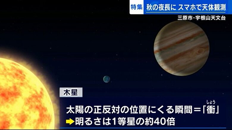 実は今 木星は、地球から見て太陽とちょうど正反対の位置にくる瞬間=「衝(しょう)」を迎えていて、国立天文台によると、1等星と比べ約40倍も明るく輝いているという。