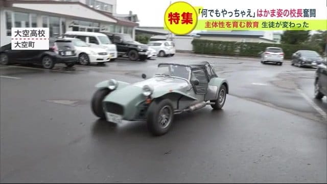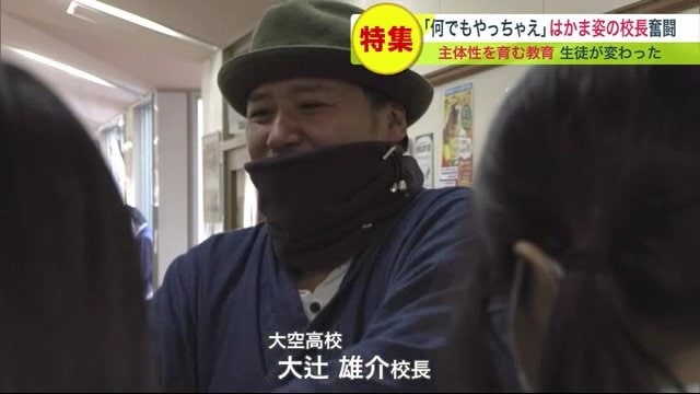 クラッシックカーで登校したのは、“はかま”がトレードマークの大空高校の校長、大辻雄介さんだ。元々は塾の講師で実は教員免許を持っていない。