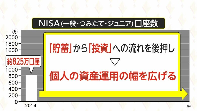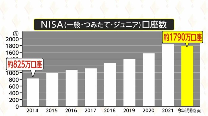 口座数は徐々に伸びて、制度が始まった8年前は825万口座だったのが、今年6月末時点で1800万近くにまで広がっていて、国民の7人に1人が口座をつくっている計算になる。