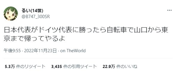 るい(14世)さんは試合開始直前の23日午後9時55分に「日本代表がドイツ代表に勝利したら自転車で山口県から東京都まで行く」と投稿し、実際に日本が勝利をおさめたため、この自転車旅が実行されるのか、注目を浴びているのだ。