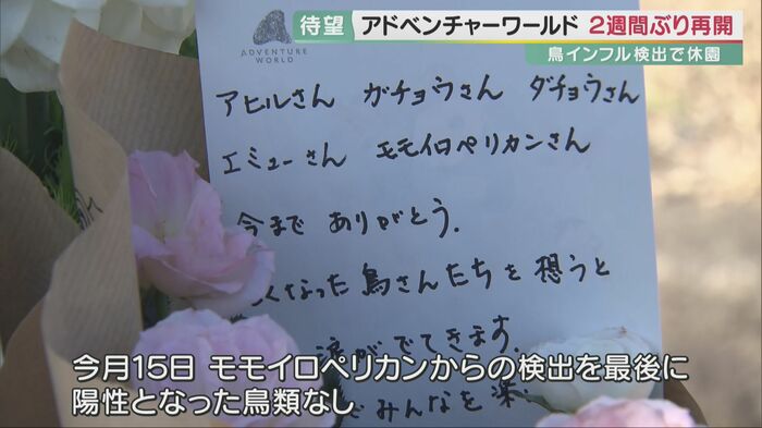 鳥インフルエンザの検出で休園が続いていた和歌山県のアドベンチャーワールドが2週間ぶりに営業を再開した。 ジャイアントパンダが元気な姿を見せる一方、鳥との触れ合いの場所は依然として立ち入り禁止となっている。