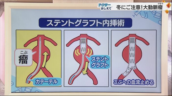 これは、足の付け根からカテーテルを血管内に入れ、コブのある部分までバネ付きの人工血管「ステントグラフト」を運び、膨らませることでコブへの血流を内側から塞いでしまうという治療法だ。