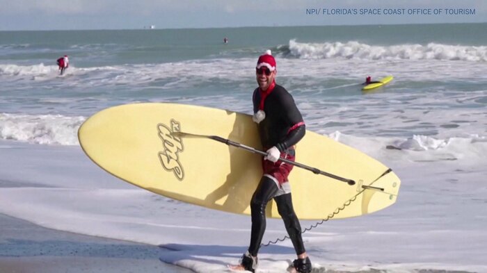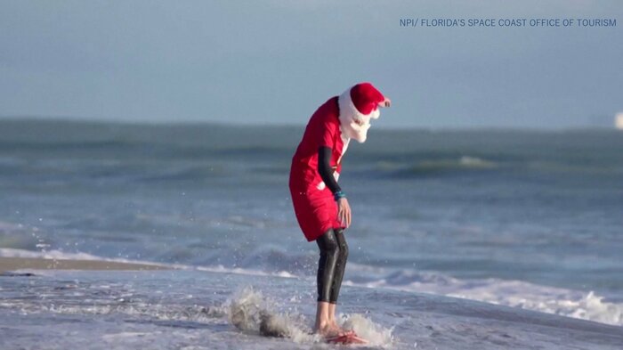 全米が記録的なクリスマス寒波に襲われる中、フロリダ州には、うってかわってビーチで波乗りをする「サーフィンサンタ」が大集合した。