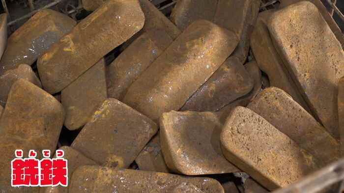 こちらは溶かす材料のヤード(置き場)でして、銑鉄(せんてつ)というもので、原料の一部です。1つ6~7キロあるんじゃないですかね。ぱっと見チョコレートみたいですけど