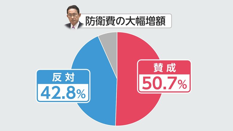 防衛費の増額について、「賛成」は50.7%、「反対」は42.8%。賛成が反対を上回った。