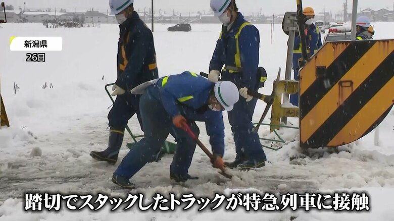 中でも危険なのが、踏切内でのスタック。1月26日、新潟県では、踏切でスタックしたトラックが特急列車と接触した。けが人はいなかったが、大事故につながりかねない危険な状況だった。