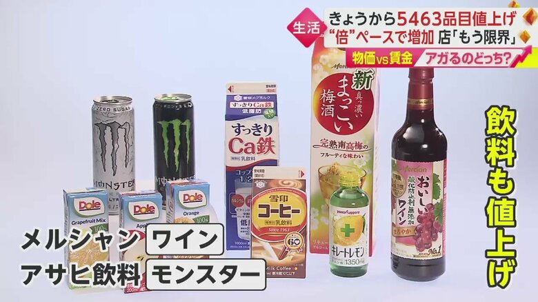 このほか、メルシャンのワインや、アサヒ飲料の「モンスター」など、値上げは飲料にも広がっている。