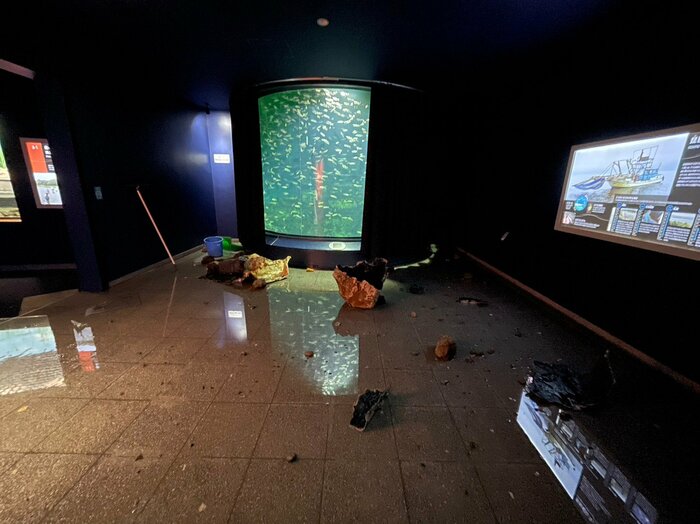 館内では、およそ100トンの水が漏れ出したため、周辺の展示室は水浸しとなり、琵琶湖博物館は一部のエリアを封鎖した。
